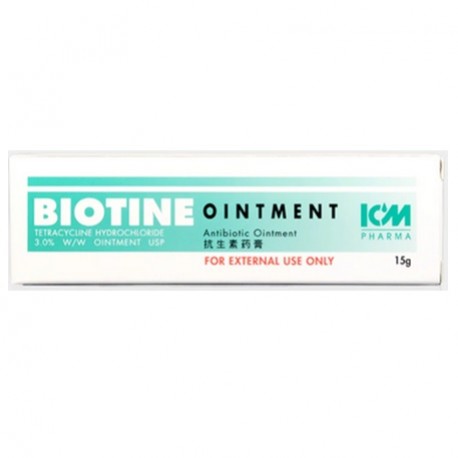 ICM Pharma BIOTINE OINTMENT contains Tetracycline Hydrochloride 3%, an antibiotic which is effective against a wide range of pathogenic bacteria. The ointment is applied topically in the treatment of Impetigo, Persistent Ulceration following deep injection of BCG Vaccine and localised superficial infections of the skin.
