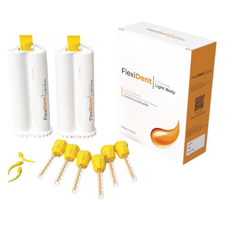 FlexiDent Light Body is a Addition Cured (A-silicon) vinyl Polysiloxane impression material. Look forward to high precision work owing to Flexident's high hydrophilicity, great linear dimensional stability, and excellent tear resistance. It is a high precision silicone, non-slumping & thixotropic in nature which is easy to work with and trim. It has high initial hydrophilicity & viscosity. It gets pushed into the sub-gingival area easily to register the details. Flexident exhibits the highest tear strength to give an accurate impression detail everytime.